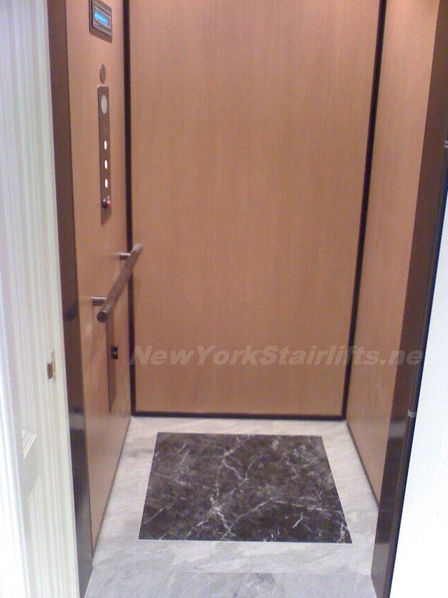 Install of this beautiful home elevator with a classic marble-finish floor |